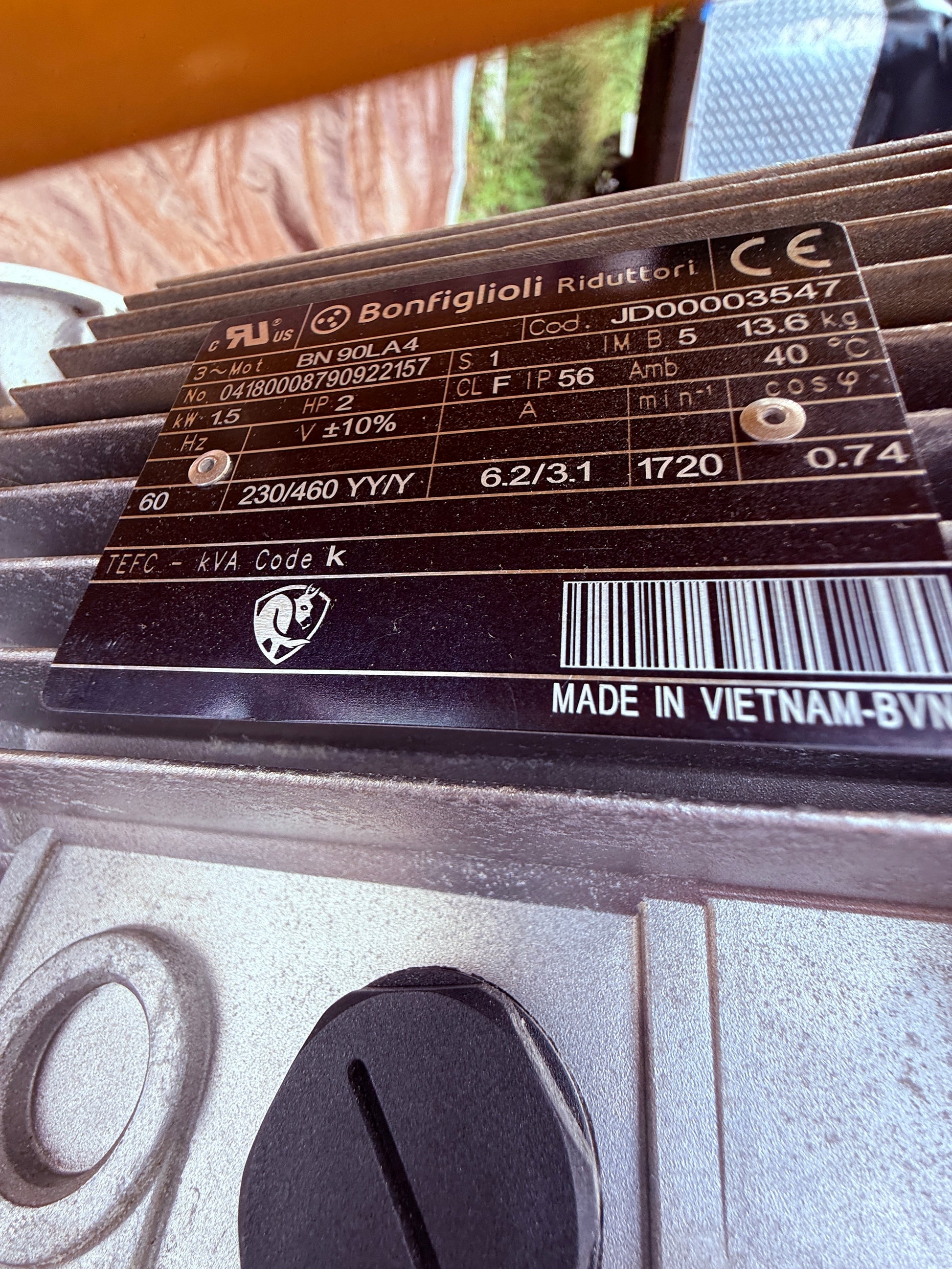 Motor & gearbox: Industrial‑grade 2‑HP Bonfiglioli motor with sealed helical gearbox; IP56‑rated housing for dust and water resistance.